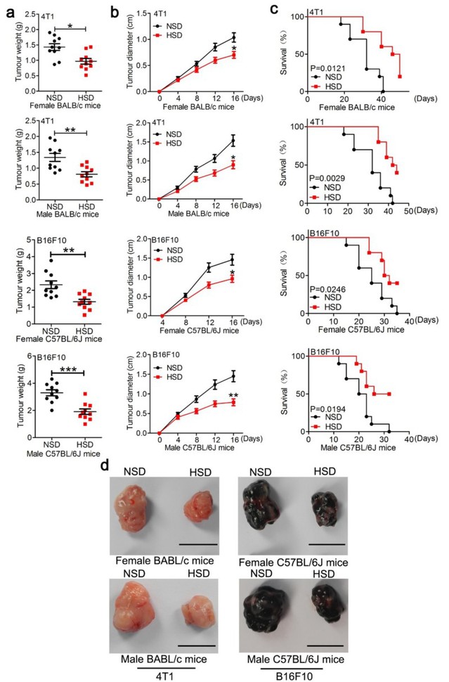 Dong Lei’s team revealed for the first time that in the tumor-bearing mice model, HSD can significantly inhibit tumor growth compared to the control group (Figure 1). The team showed that HSD increased the local concentration of sodium chloride in tumor tissues and thus increased the osmotic pressure but reduced the production of cytokines required for the proliferation of myeloid-derived suppressor cells (MDSCs) and their accumulation in the blood, spleens and tumors.