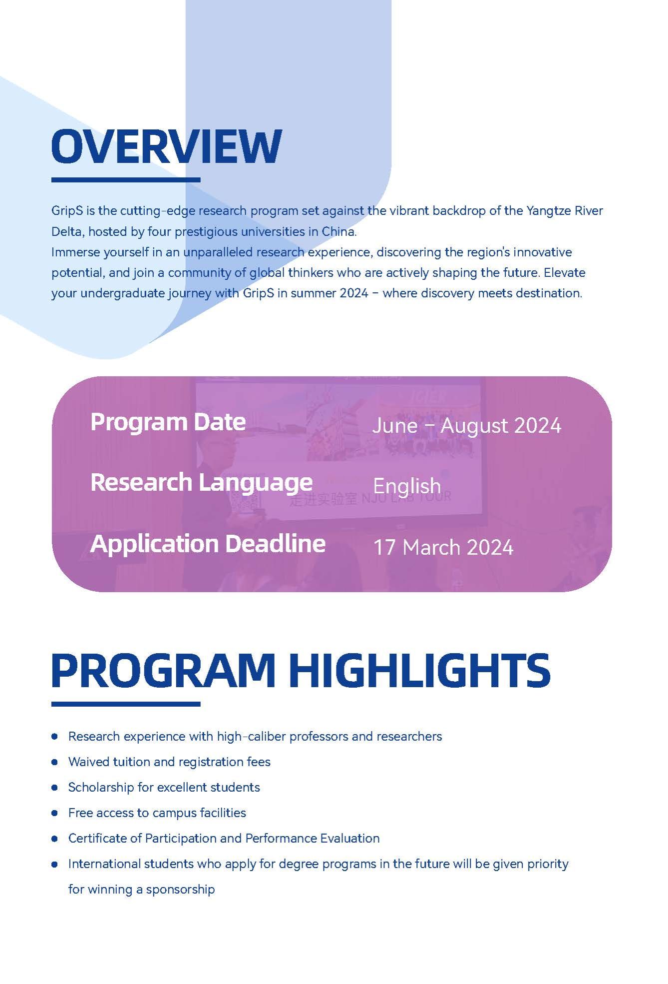 From June to August, GripS students will have the unique opportunity to actively engage in a robust research program, which includes laboratory experience, industry visits, excursions around the picturesque Yangtze River Delta region, immersive Chinese cultural activities, enlightening lectures by esteemed academicians, and a supportive mentorship component.