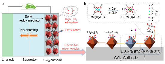 1 基于RM(II)-BTC固态氧化还原介质的锂二氧化碳电池原理图及机理图。