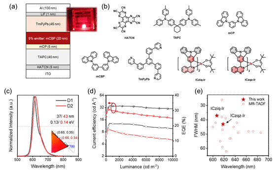 有机发光二极管(OLED)作为一种主流的平面显示技术,受到了企业界和学术界的广泛关注。铱配合物由于其较短的磷光寿命、较高的量子产率以及易调节的发光颜色,已经在商用的绿光和红光OLED材料方面取得了巨大的成功。然而,铱配合物普遍存在的发光谱较宽、色纯度较差的问题,严重制约其在高清、高色域显示面板中的应用。虽然当前热门的多重共振热活化延迟荧光(MR-TADF)材料可以显示窄谱带发射和高发光效率,但是其较长的三线态寿命会导致相应的OLED器件效率滚降非常的严重。目前针对铱配合物光谱窄化及其内在原理的深入探究相对匮乏,阻碍了磷光铱配合物的应用升级。