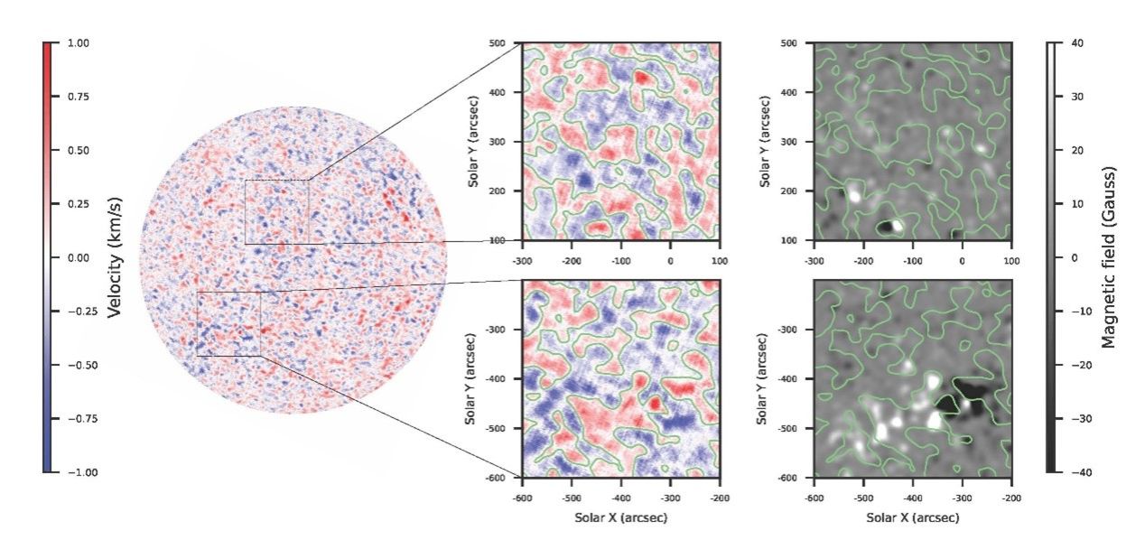 进一步的研究发现,这种反常的自转现象是由无处不在的小尺度磁场及其与太阳大气的“磁冻结”效应造成的。与大尺度磁场不同,这些小尺度磁场形成于近表面的速度剪切层(0.95–1个太阳半径处),该层次相比于太阳大气具有更快的自转速度。由于光球层电离度较低,密度较高,“磁冻结”效应不明显,因而这些小尺度磁场对太阳大气的拖曳能力较差;而在色球层及更高层的太阳大气,电离度较高,”磁冻结“效应显著增强,磁场得以更高效地拖拽太阳大气,使这些层次的自转速度明显快于光球层。图3所示为色球速度场与磁场的空间分布比较,可以看到二者有很好的相关性,表明小尺度磁场与色球大气存在强冻结效应。