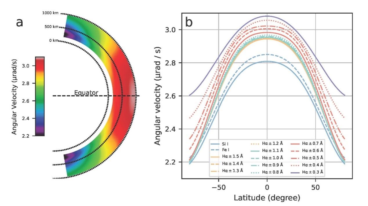 然而,对于太阳表面的大气层,它的自转速度的变化规律,至今没有确切的定论。最近,凯发k8官网“羲和号”团队利用其独特的多谱线、全日面、高精度的观测数据,针对该问题做了深入、细致的探索,得到了比较确切的答案。