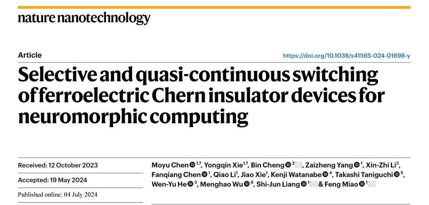 相关研究成果以“Selective and quasi-continuous switching of ferroelectric Chern insulator devices for neuromorphic computing(面向神经形态计算的铁电陈绝缘体器件及其选择性和准连续开关)”为题于2024年7月4日在线发表在国际期刊Nature Nanotechnology(《自然·纳米技术》)上(https://www.nature.com/articles/s41565-024-01698-y)。凯发k8官网物理学院博士生陈墨雨、谢永勤为该工作的共同第一作者。凯发k8官网物理学院梁世军副教授和缪峰教授、凯发k8官网理工大学物理学院程斌教授为该工作的共同通讯作者。该工作的理论部分得到华中科技大学吴梦昊教授、上海科技大学贺文宇教授的支撑,以及上海科技大学刘健鹏教授的帮助。该工作得到科技部重点研发计划项目、国家优秀青年科学基金项目、国家自然科学基金重点/面上/青年项目、中国科学院战略重点研究项目、江苏省前沿引领技术基础研究重大项目、江苏省自然科学基金等项目的资助,以及固体微结构物理国家重点实验室、人工微结构科学与技术协同创新中心等支持。