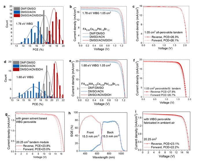 利用这种绿色溶剂体系,研究人员成功制备了带隙值为1.78 eV和1.68 eV的宽带隙钙钛矿太阳能电池,分别实现了19.6%和21.5%的高光电转换效率。在此基础上,制备了1 cm2的全钙钛矿和钙钛矿/晶硅叠层太阳能电池,分别达到了26.3%和27.8%的光电转换效率;此外,大面积全钙钛矿叠层光伏组件也实现了23.8%的光电转换效率。更令人振奋的是,该绿色溶剂体系适于在大气环境下制备宽带隙钙钛矿太阳能电池,在大气条件下制备宽带隙子电池的全钙钛矿叠层组件实现了23.1%的光电转换效率。