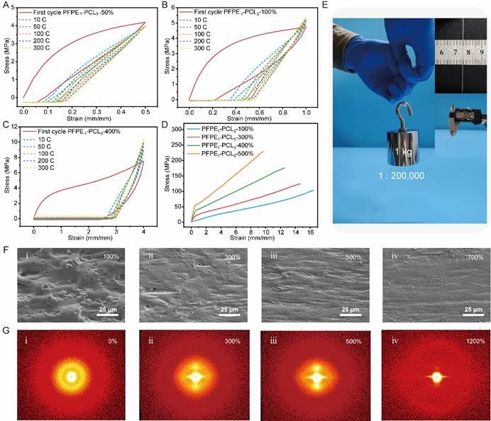 由于全氟聚醚(PFPE)具有极低的玻璃化转变温度(低于-100 ℃)以及高链段自由度和流动性,可以作为软段显著提升材料的柔软性。聚己内酯(PCL)则作为易结晶的硬段,为材料提供了基本的力学强度。PFPE与PCL链内和链间相互作用(如偶极-偶极作用)促进了自组装及微相分离结构的形成,同时抑制了PCL的结晶行为。因此,在室温和无外力作用下,材料呈现非晶态,从而保持柔软性(图2)。在外力拉伸作用下,聚集的非晶态聚合物链展开、伸直,并沿加载方向重新排列。这种结构转变显著增强了材料在拉伸方向的强度,在大变形下表现出强大的能量耗散能力,赋予材料高拉伸强度、高韧性、抗撕裂和抗穿刺性能。在循环拉伸过程中,PCL链段容易从非晶区中逃逸,形成沿加载方向的链间微晶结构,使材料表现出类似于肌肉的训练增强特性(图3)。