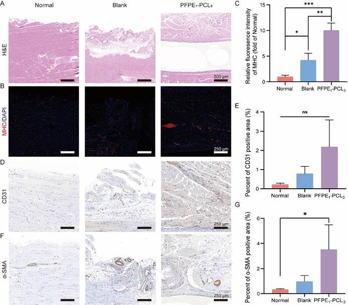 该人工肌肉展现出了极高的生物相容性,通过活/死染色和CCK-8细胞活力测试,证实该材料对肌细胞无毒性,且细胞活力与对照组相比没有显著差异,表明材料不会对肌细胞造成不良影响。在与C2C12肌细胞共培养7天后,通过肌钙蛋白重链(MHC)染色显示,在该人工肌肉上培养的肌细胞形成了沿材料拉伸方向排列的肌管,这表明材料能够促进肌细胞的生长和分化,有助于肌肉组织的再生(图5)。在大鼠VML模型中,该人工肌肉被植入后,其出色的弹性和柔软性使得材料能够与残余肌肉一起灵活运动,而不会因为传统手术缝合和石膏固定而导致肌肉萎缩或关节功能障碍。此外,材料的高机械强度使得大鼠在支架植入后能够维持日常活动。在植入后的组织学评估中,材料显示出促进肌肉组织沿支架生长的能力,并且在4周后,再生的肌肉展现出良好的结构和形态。此外,通过CD31和α-SMA染色评估的血管再生也显示出积极的趋势,表明该人工肌肉有助于改善血管化,这对于肌肉再生至关重要(图6)。