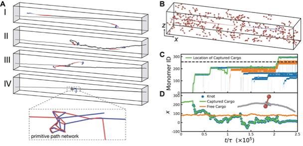 图5:(A)两条相对的非活性-活性嵌段分子链可以快速地形成复杂的链间纽结。(B)包含一条嵌段分子链和多个哑铃形货物的系统。(C,D)嵌段分子链上纽结随时间的演化以及被捕获的货物在分子链上的相对位置迁移。