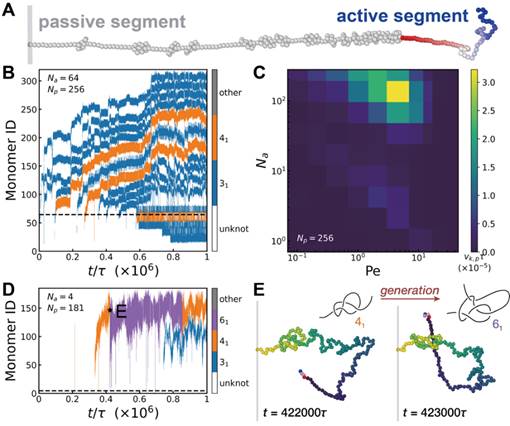 图4:(A)自发打结的非活性-活性嵌段分子链。(B)嵌段分子链上纽结随时间演化图,其中虚线代表非活性-活性链段的边界。(C)嵌段分子链上非活性链段打结速率vk,p在活性链段长度-活性(Na-Ρe)空间上的相图。(D)短活性链(活性针)在非活性分子链上直接编织纽结。(E)活性针在非活性分子链上的穿线和打结的模拟快照,对应于D图中的五角星标记。
