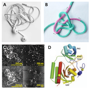 图1:不同尺度的纽结拓扑态:(A)耳机线,(B)毛线,(C)DNA分子,(D)蛋白质。