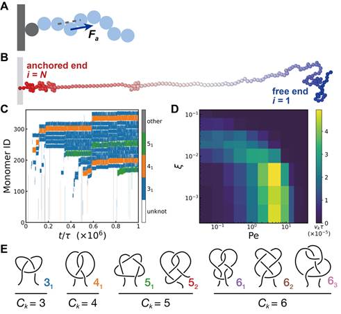 图2:(A)锚定的活性链模型。(B)包含4个结的活性链的模拟快照。(C)纽结随时间的演化图,不同颜色代表不同的纽结拓扑。(D)活性链打结速率vk的活性-刚性(Ρe-ξ)相图。(E)不同纽结的拓扑投影。
