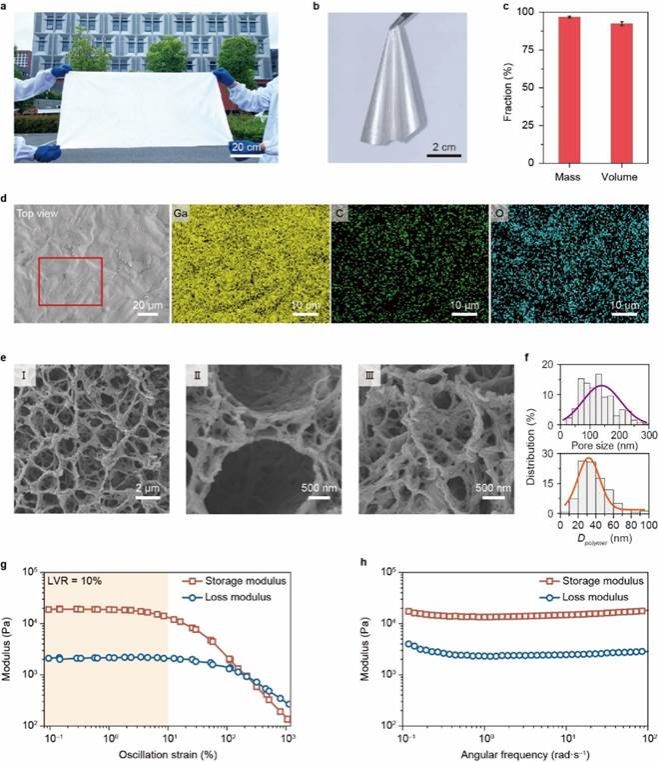 近日,凯发k8官网张晔课题组设计制备了一种金属凝胶的新材料,液态金属作为流体,首次引入到凝胶材料中,通过静电相互作用固定填充在相互连接的纳米级高分子网络中,其中液态金属在凝胶中占据96.83%的质量分数和92.40%的体积分数(图1)。