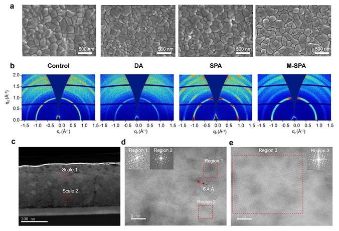 图2. 宽带隙钙钛矿薄膜的表征。a-b, 采用Control,DA,SPA和M-SPA方法制备的钙钛矿薄膜的SEM (a)(比尺为500 nm)和GIWAXS (b)图像。c, M-SPA薄膜的TEM图像。d-e, Scale 1 (d)和Scale 2 (e)的HR-STEM横截面图像。