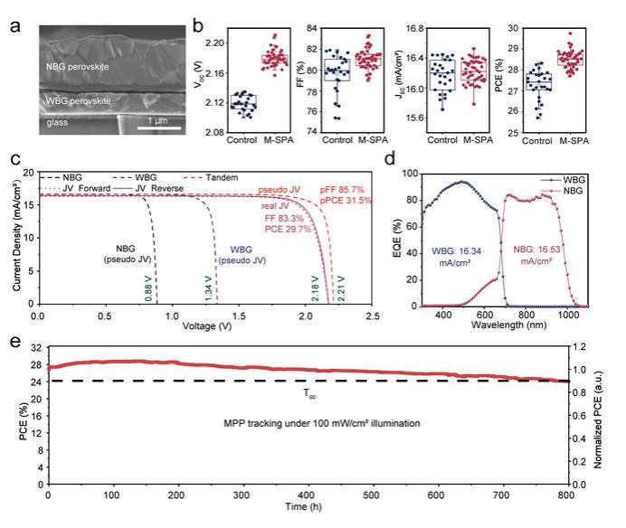 结合以上研究和器件设计的思路,通过将该宽带隙子电池与高效的窄带隙子电池进行串联,结合良好的光电匹配设计,构筑了高性能的全钙钛矿叠层太阳能电池(图4a)。M-SPA制备策略的应用有效地提升了全钙钛矿叠层电池的开路电压、填充因子以及转换效率(见图4b)。该器件实验室自测光电转换效率实现了创纪录的29.7%,开路电压高达2.175 V,电流密度为16.4 mA·cm-2,填充因子为83.3%(图4c-d)。在持续的近红外LED照明下,该器件连续运行750小时仍能保持其初始转换效率的90%,展示出优异的光照稳定性(图4e)。经国际权威机构JET第三方认证,全钙钛矿叠层太阳电池的稳态光电转换效率高达29.1%。上述优异的稳定性与转换效率表明,M-SPA方法在全钙钛矿串联太阳能电池的实用化过程中发挥了关键作用,为未来商业应用奠定重要基础。