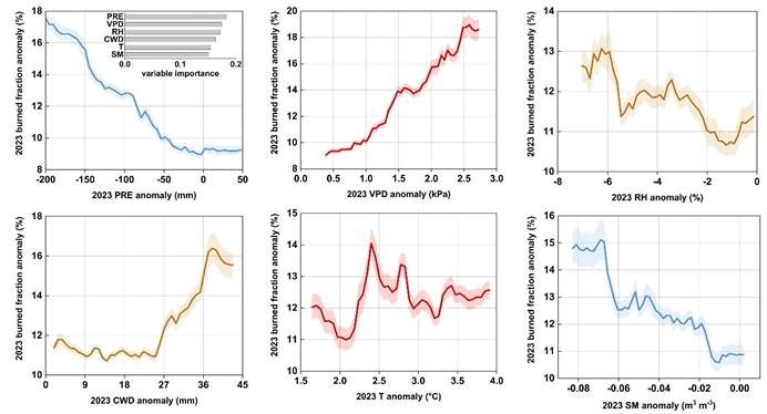 进一步分析了此次极端野火背后的主要气候驱动因子。结果发现,2023年加拿大出现破纪录的极端高温和干旱。2023年火灾季节(5月至9月)的气温(T)高出历史平均水平2.64℃之多,其中5月的变暖达到4.48℃。另外,2023年的降水(PRE)出现异常亏缺,比历史平均水平少73.3毫米,导致加拿大出现持续的异常干旱。极端的高温和降水亏缺导致了极端的大气干旱(VPD和RH)和土壤干旱(SM),进而加剧植被水分胁迫(CWD),使得可燃物含水率下降,可燃性增加(图2)。此外,利用机器学习算法分析各气候因子的相对重要性,发现异常的降水亏缺和加剧的大气干旱主导了2023年加拿大的极端野火(图3)。