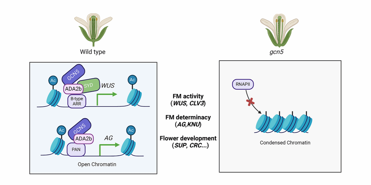 表观遗传修饰是调控基因表达的核心机制之一。在基因激活过程中,核心组蛋白N端尾部特定赖氨酸残基的乙酰化修饰由组蛋白乙酰转移酶 (Histone acetyltransferases, HATs) 催化完成,这一过程直接决定染色质结构的动态重塑。其中,GCN5 (GENERAL CONTROL NON DEREPRESSIBLE 5) 作为研究最为深入的组蛋白乙酰转移酶之一,已被证实参与根系发育、逆境响应等多种生物学过程。然而,GCN5如何通过表观遗传编程调控花分生组织 FM活性及花发育仍有待深入研究。