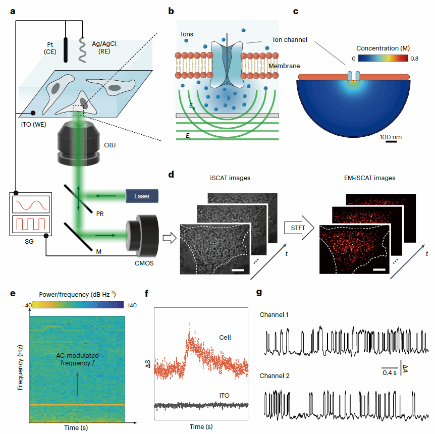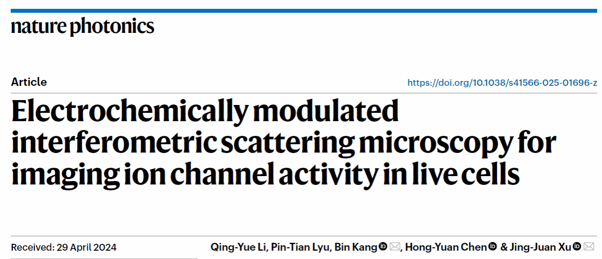 凯发k8官网徐静娟/康斌团队向这一百年测量学难题发起挑战,创新性提出了基于电化学调制干涉散射的免标记神经成像方法。摒弃了以离子导通电流来测量离子通道活性的研究思维。从离子通道本身的物理属性出发,提出了免标记光学成像方法测量离子通道局部离子扩散场的全新测量原理,从原理上突破膜片钳通量低的限制。同时,摒弃了必须通过荧光标记来定位离子通道的模式,而利用局域离子场的扩散属性来实现不同离子通道的定位和识别。且不需要任何荧光标记或者电极封接,最大程度降低细胞损伤,实现细胞上大量离子通道的高通量并行成像。研究结果发表于2025年6月份的Nature Photonics杂志(Nature Photonics, 2025, doi: 10.1038/s41566-025-01696-z);博士生李庆悦为论文第一作者,康斌教授和徐静娟教授为论文通讯作者。