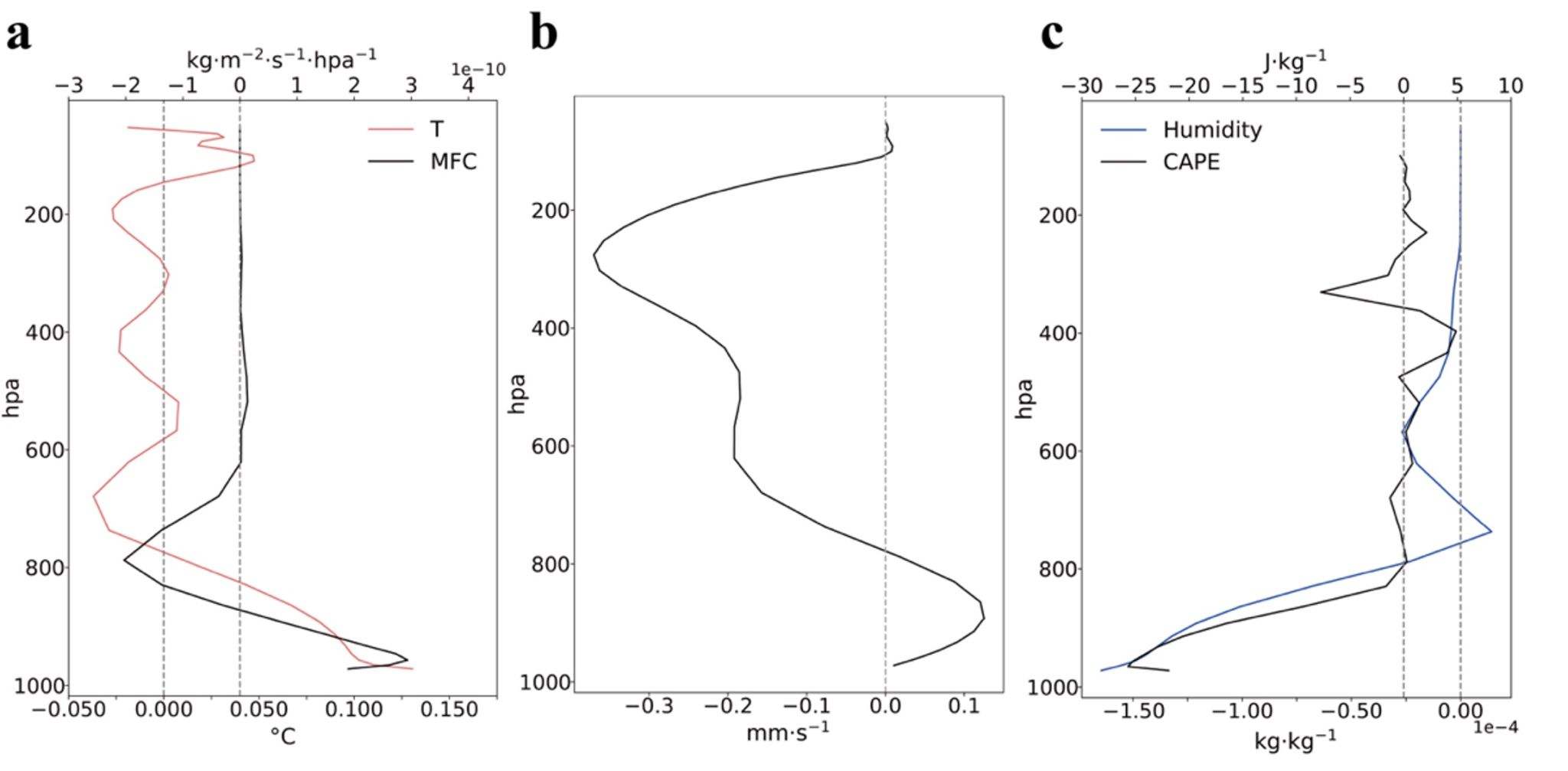 通过水汽示踪分析,发现干季降水减少的76.9%可归因于非局地水汽输入的减少,仅有23.1%可归因于局地蒸散发的下降。而局地水循环变化引发的大气响应机制进一步放大了降水减少的效应:在干季,森林流失使地表蒸散发与潜热通量下降,造成地表干燥、增温,对流层低层比湿减少,降低了对流有效位能(CAPE),进而更加抑制了对流活动和降水形成。定量分析表明,降水转化效率的下降解释了84.5%的干季降水减少,而对流层高层的冷却则限制了高空水汽的输入。