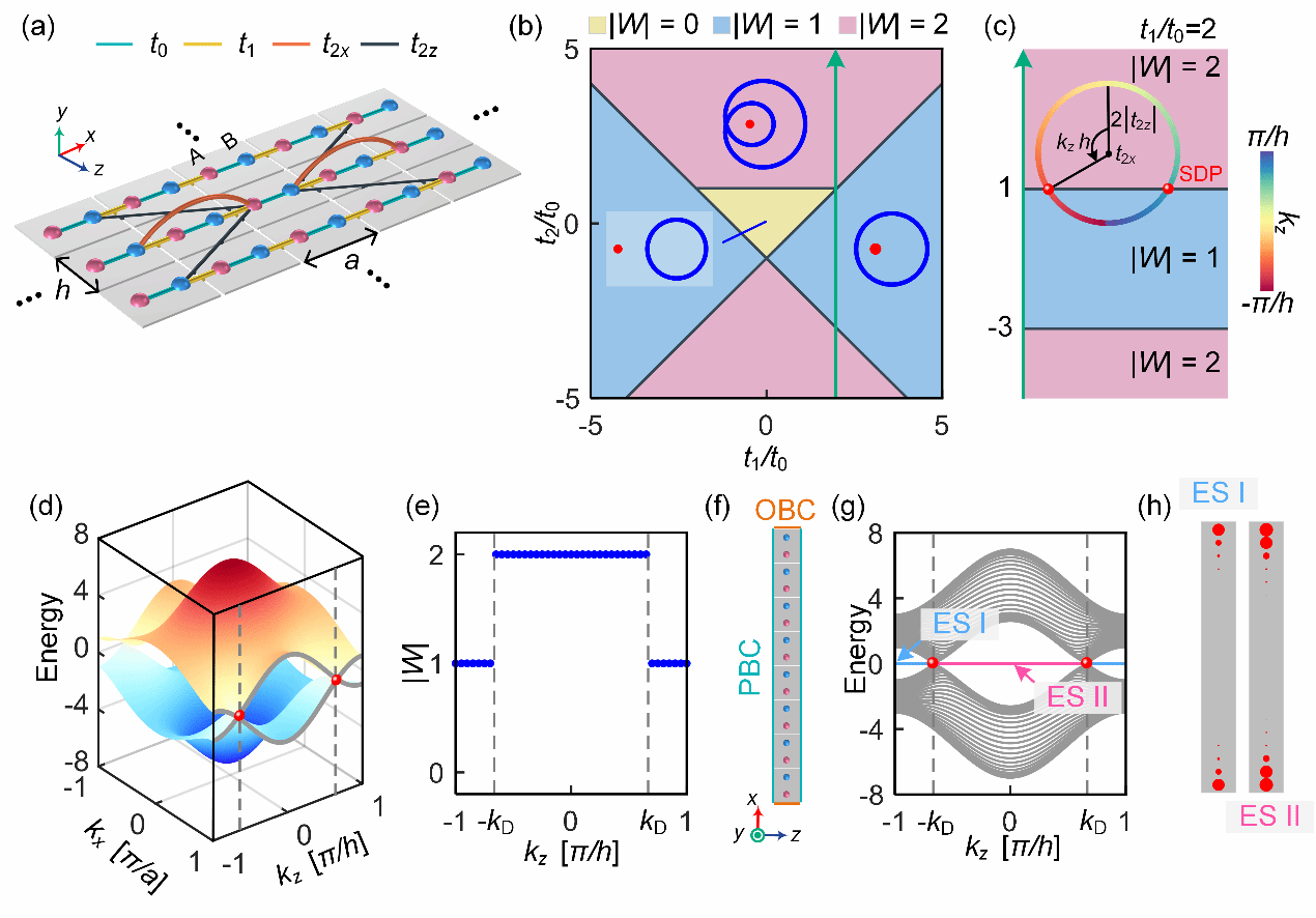 图2. (a) 二维拓扑半金属的结构示意图。(b) 等效一维结构对应的相图。(c)图(b)中绿线对应的相变过程。(d) 一种具有第二类半狄拉克点的拓扑半金属体能带。(e)缠绕数随kz的变化。(f)超胞结构和(g)投影能带。(h)两种不同拓扑边界模式对应的场分布。