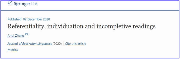近日,文学院特聘副研究员张安琪为独立作者完成的研究成果“Referentiality, individuation and incompletive readings(指称性、个体化以及非完整解读)”在国际知名语言学期刊Journal of East Asian Linguistics (JEAL)在线发表。